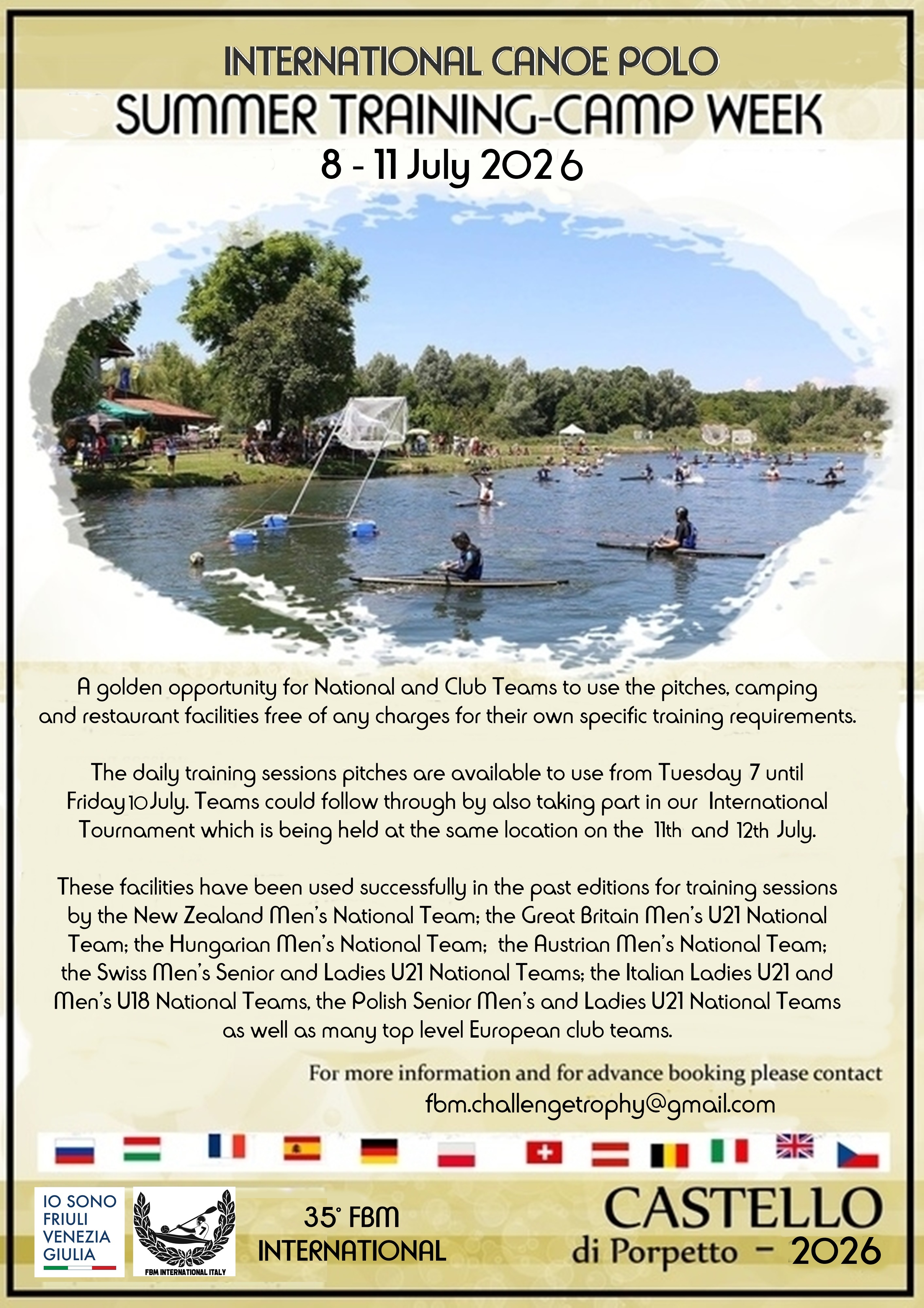 To take part in the training camp the Club/Team member must download the ‘2026 Summer Camp Registration Form’, found below, fill out the information asked and return it to the Organizing Committee (fbm.challengetrophy@gmail.com) within the date of 15th June 2026. There is no charge for taking part in the Training Sessions’ or staying at the campsite, however there are rules for using the campsite of which the downloadable ‘Camping Rules’ must be respected strictly. There will be pitches available to train on from 08:00 A.M. until 20:00 P.M. subject to availability. Toilets and shower units will be available for the days of the Training Sessions, which are situated at the entrance to the camping area. It is also possibile to register and take part in our 35° International held on the weekend of the 11th and 12th July.